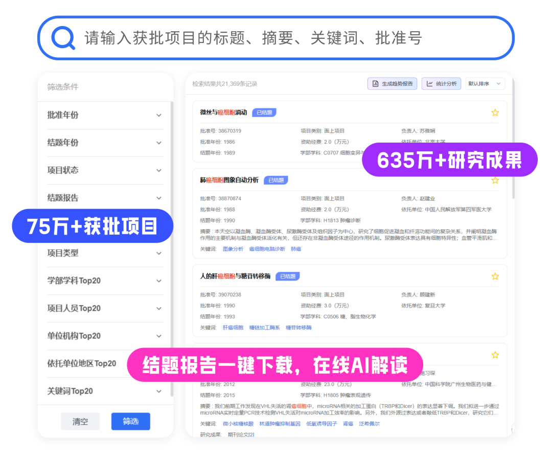 - MedPeer覆盖75w国自然获批项目数据,支持关键词精准检索,快速定位领域研究现状;