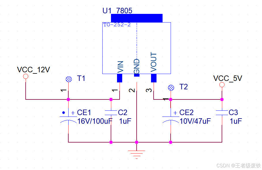 输入阶段:12V 直流电压从 VCC_12V 输入,经 CE1 和 C2 滤波后,送入 7805 的 VIN 引脚。