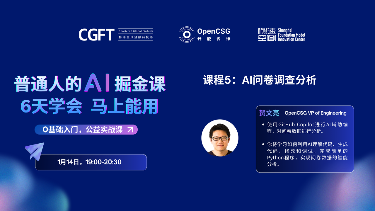 由特许全球金融科技师CGFT认证项目(Chartered Global FinTech) 、模速空间与OpenCSG(开放传神)联合推出《普通人的AI掘金课------6天学会,马上能用》系列直播课程,提供了一条非常清晰的上升路径:先学会用提示词把任务"说清楚",再学会用AI把它"做成程序",最后把程序"变成可运营的流程"。