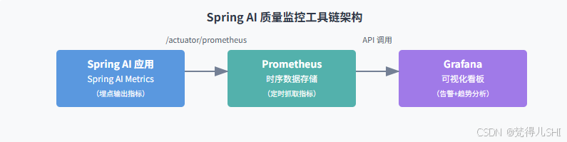 要实现评估指标的实时监控,需搭建 "Spring AI Metrics 埋点 → Prometheus 数据存储 → Grafana 可视化" 的工具链。这套组合的优势在于:Spring AI 原生支持 Metrics 输出,Prometheus 擅长时序数据存储,Grafana 可快速构建交互式看板。
