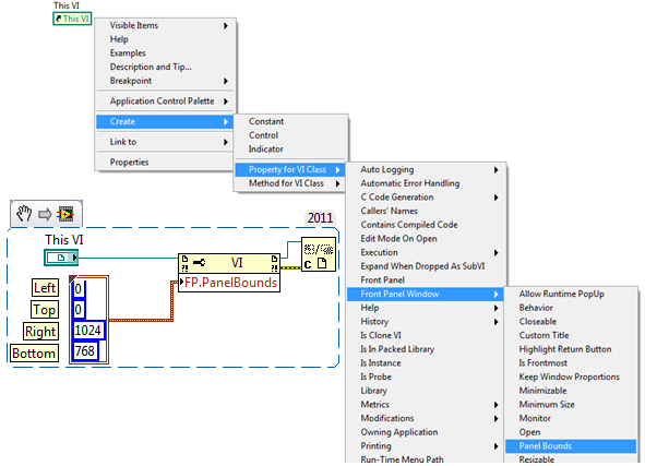 2.右键单击「VI 服务器引用」终端,依次选择「创建」>>「VI 类的属性」>>「前面板窗口」>>「前面板边界(FP.PanelBounds)」,生成对应的属性节点;