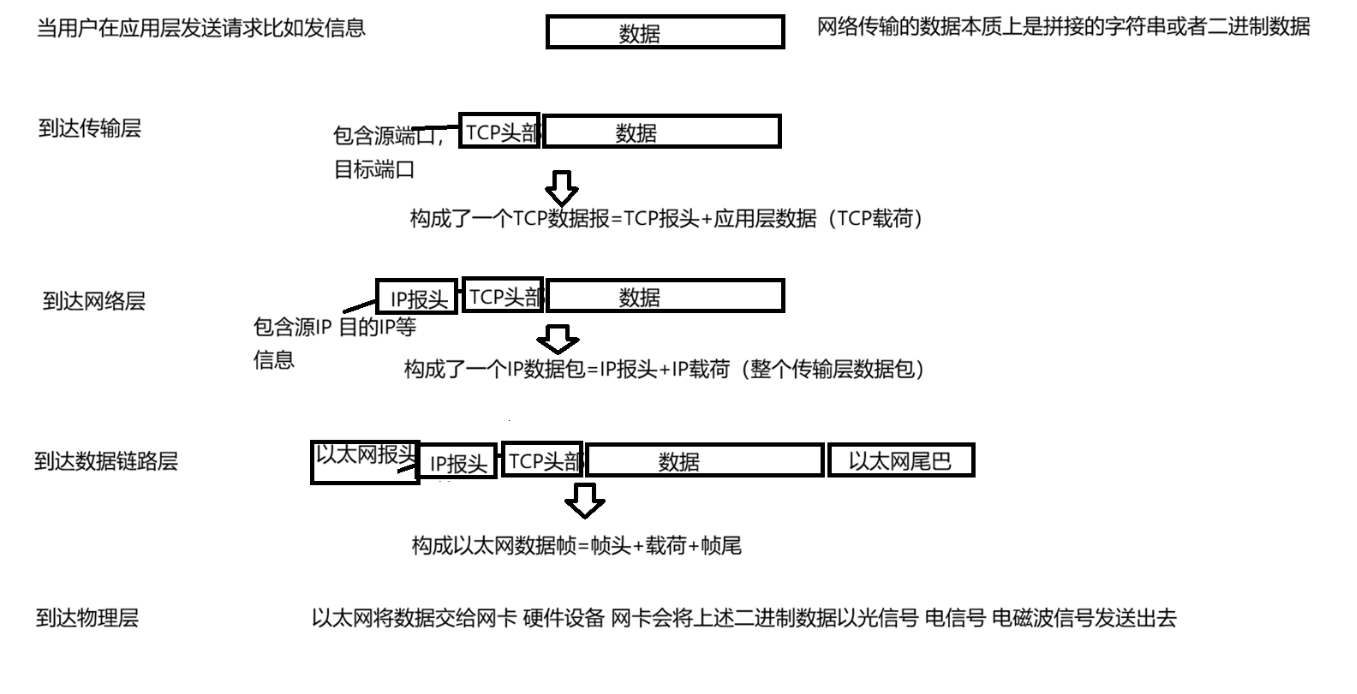 数据链路层 :添加 以太网头部和尾部 (包含源 MAC 地址、下一跳的 MAC 地址),形成 以太网帧,准备在本地局域网发送。