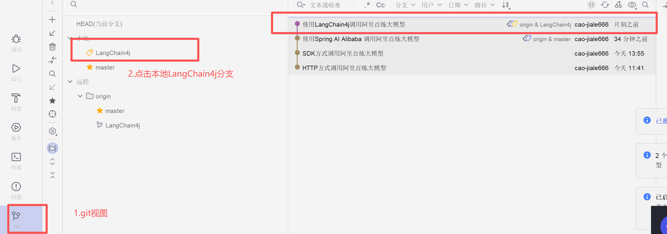 测试成功我们可以在LangChain4j提交一个版本,利用IDEA的GIT管理视图可以看到版本日志