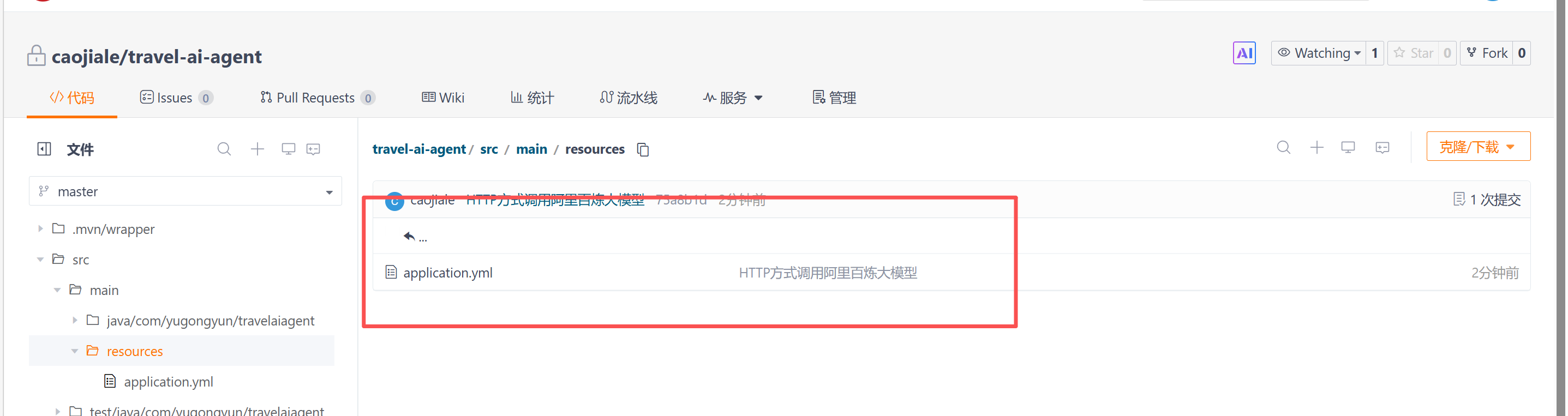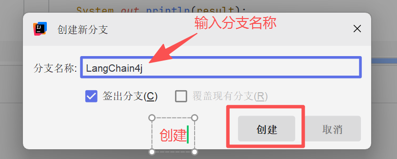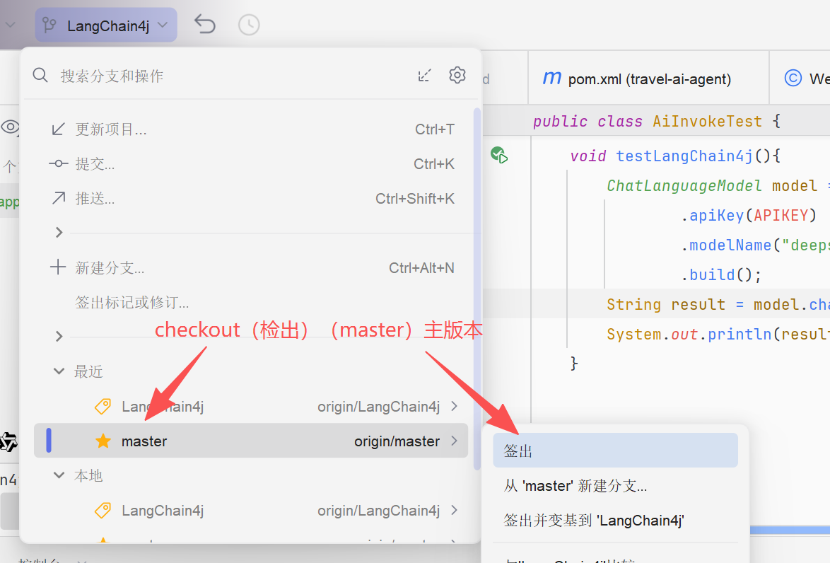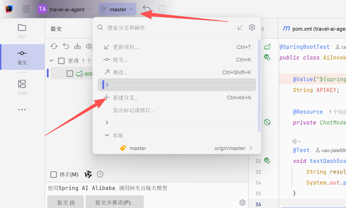 由于LangChain4j只是测试,我们可以创建一个git分支来做测试,避免影响主分支代码,如果没有使用git此步骤可以忽略