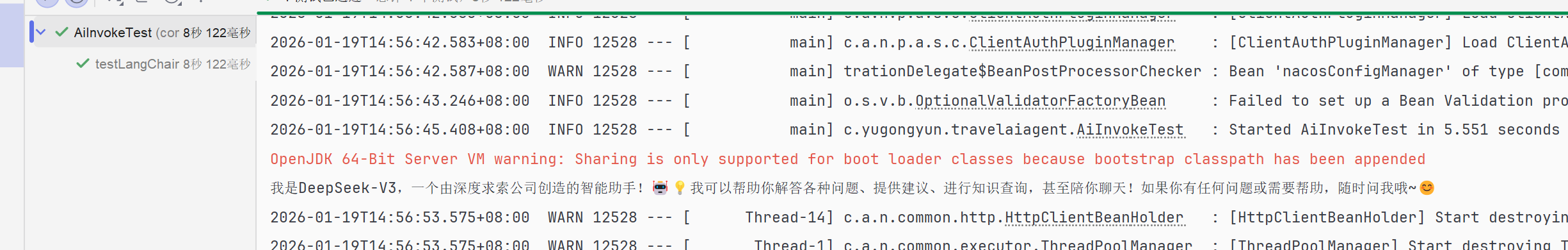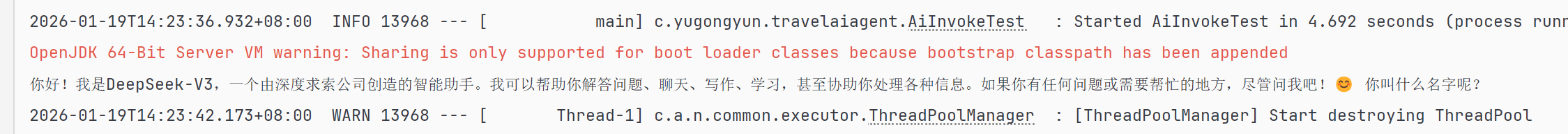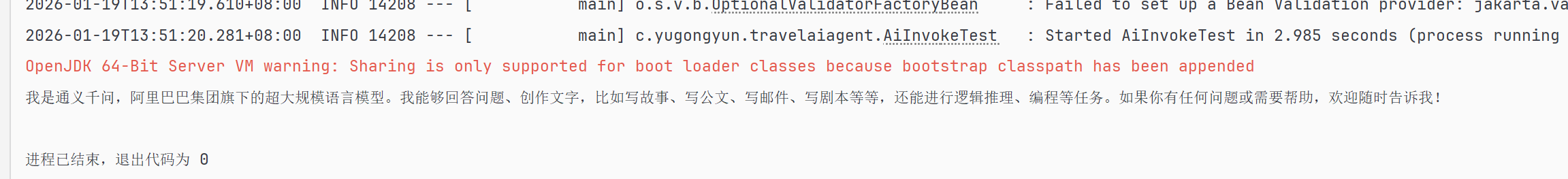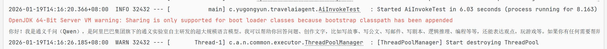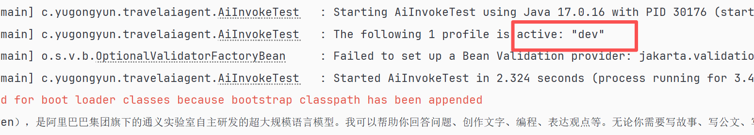 从运行结果来看,如果没有配置大模型类型,则默认使用阿里通义千问大模型,我们可以通过配置文件进行修改