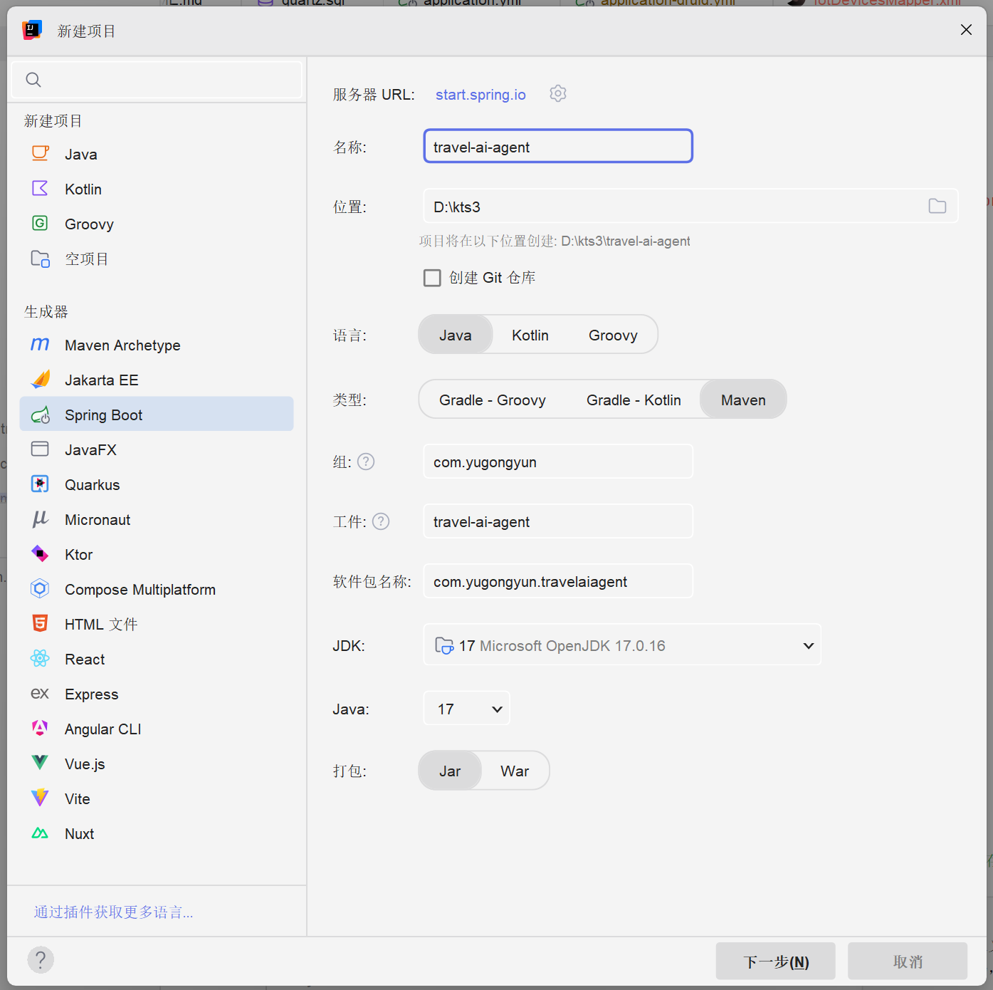 由于本项目使用的是Spring Boot 3和Spring AI开发框架,所以安装的JDK必须是17或21,不能选择其他版本