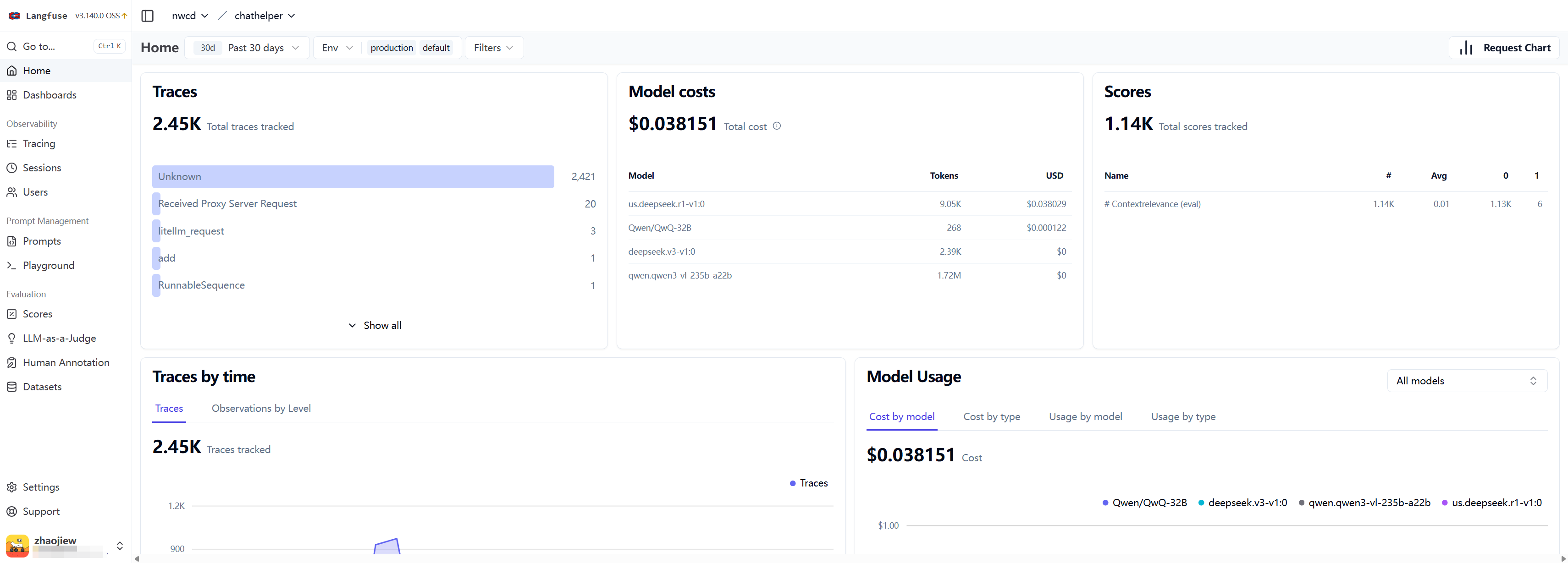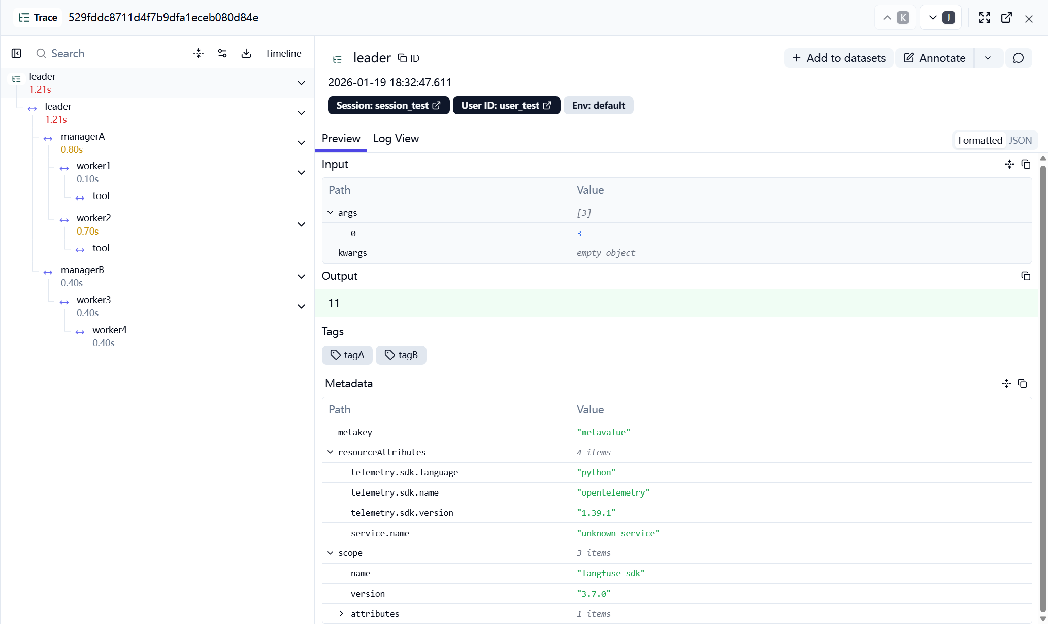 user_id)、会话信息(session_id) 和 标签 (tags) 会被上传到 Langfuse 服务器,方便你后续根据用户或特定标签进行搜索和分析成本。 @observe装饰器会在函数进入时记录时间戳,并在函数返回时再次记录。两者相减就得到了每个环节的耗时(Latency)