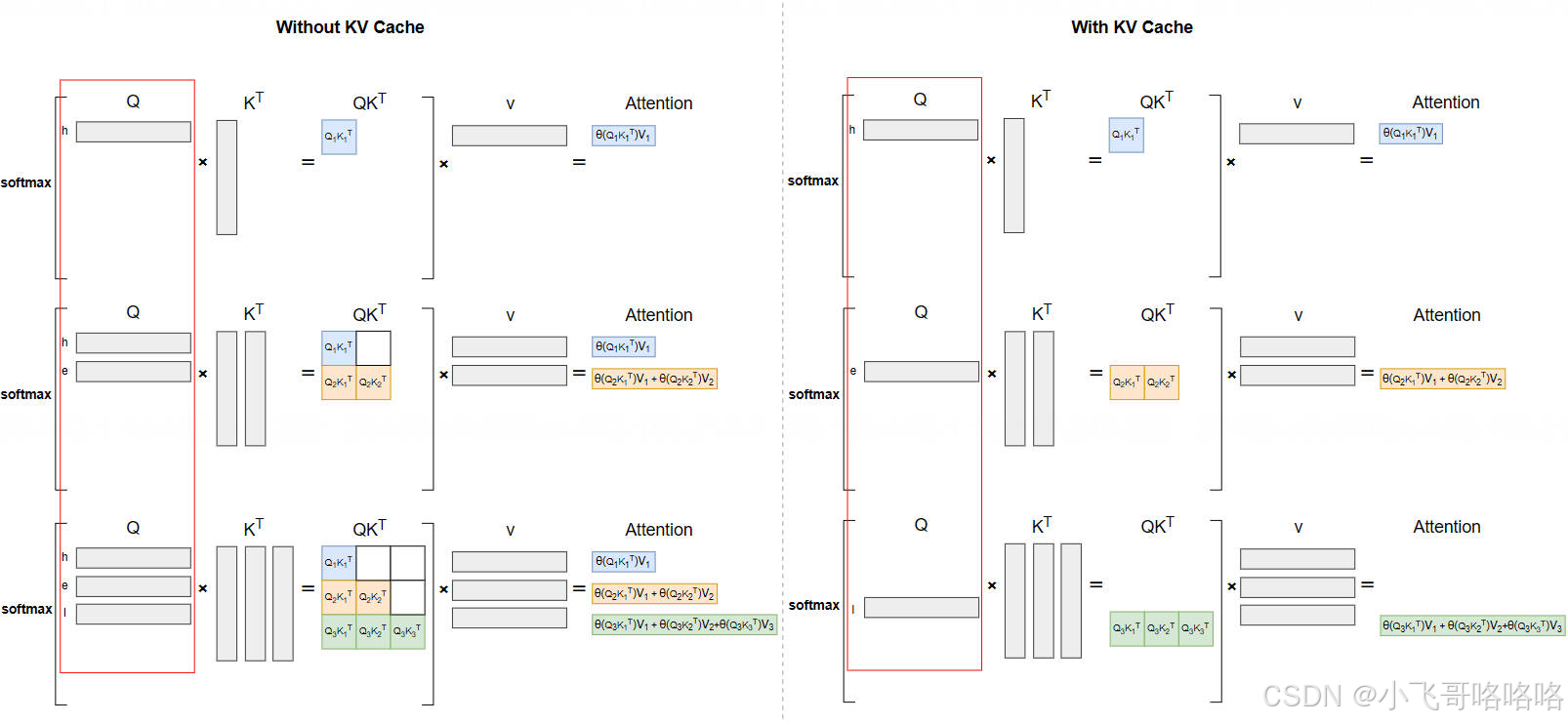 但我个人觉得这个图不能体现KV Cache减少计算的情况,因为看起来Attention的结果在前后也有优化,但实际上左边的Q也可以改成单个的,关键的是不需要重复计算K和V了。