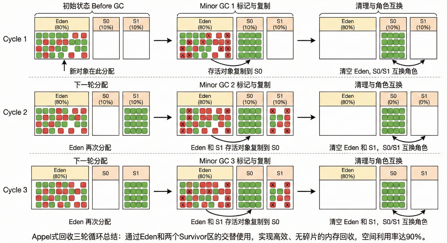 空间利用率:每次新生代可用空间为90%(80% Eden + 10% Survivor),只有10%被"浪费"。