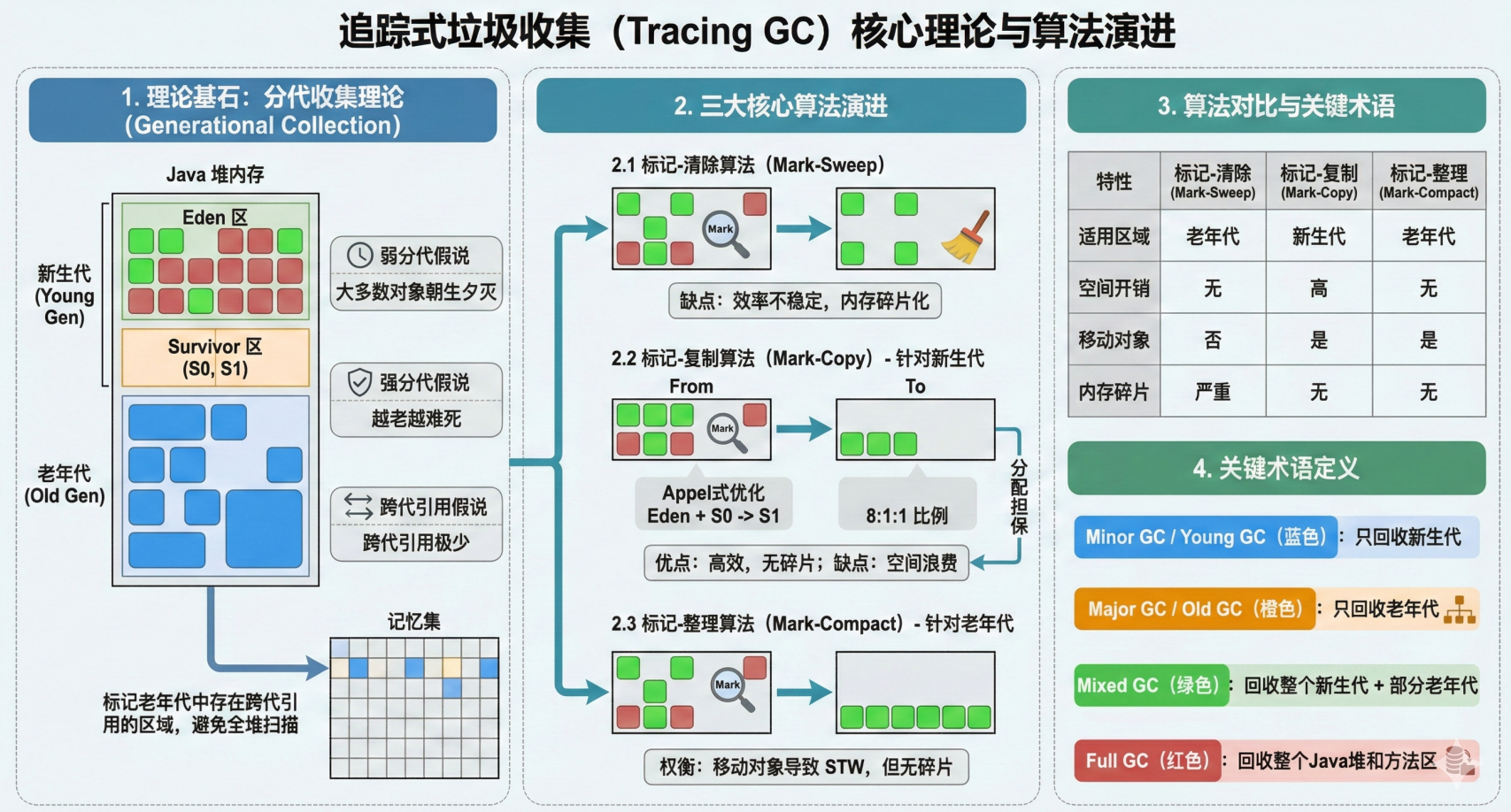 | 特性 | 标记-清除 (Mark-Sweep) | 标记-复制 (Mark-Copy) | 标记-整理 (Mark-Compact) |