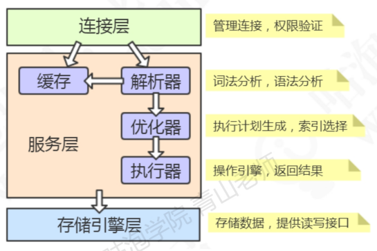 客户端要通过3306端口与MySQL服务端建立连接,MySQL有专门处理连接的模块,连接的时候需要验证权限。