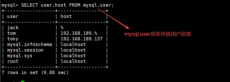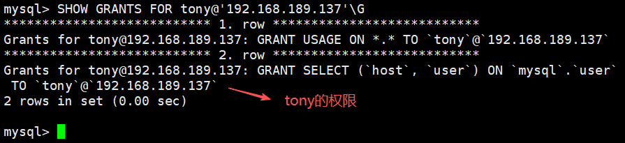 GRANT SELECT(user,host) ON mysql.user TO tony@'192.168.189.137'; -授予tony用户mysql库下user表下的user,host字段查找权限