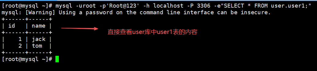 mysql -uroot -p'Root@123' -h localhost -P 3306 -e"SELECT * FROM user.user1;"