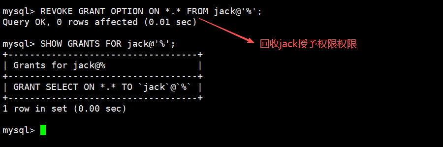 GRANT SELECT ON *.* TO jack@'%' WITH GRANT OPTION; -授予jack授予权限权限