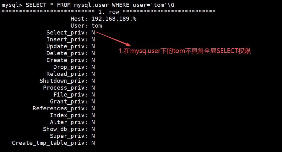 tom用户不具备全局SELECT权限,但具有对mysql库下所有表的SELECT权限