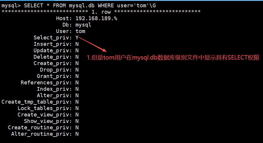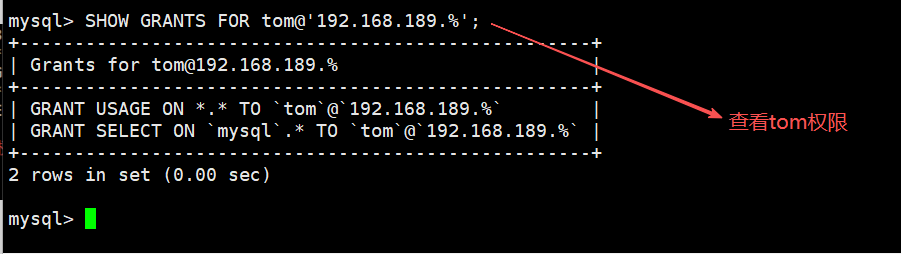 GRANT SELECT ON mysql.* TO tom@'192.168.189.%'; -授予tom用户mysql库下的所有表的查询权限