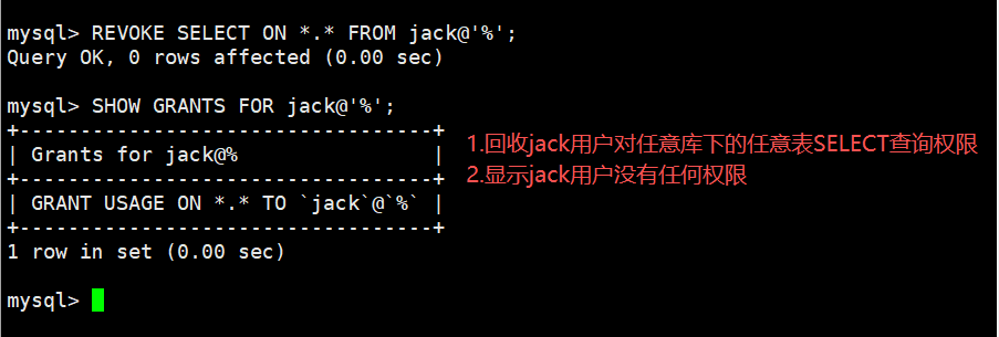 GRANT SELECT ON *.* TO jack@'%'; -授予jack用户任意库下任意表的查找权限