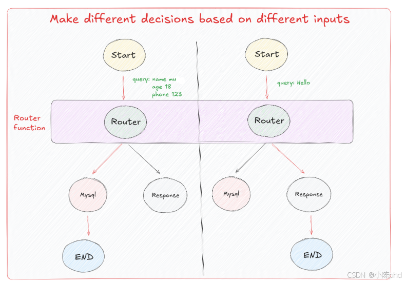通常情况下,Agent能够处理多种格式的输入数据,并通过内置的路由逻辑确定具体执行的操作流程。如图所示,Agent的起始节点(Start)接收输入信息,这些输入可能包含结构化查询(如"name: muyu, age: 18, phone: 123")或简单对话内容(如"Hello")。系统会根据输入类型,通过Router函数进行智能路由,将不同请求分发至对应的处理流程。