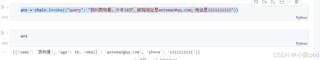 ans = chain.invoke({"query": "我叫奥特曼,今年38岁,邮箱地址是aoteman#qq.com,电话是1211111111"})