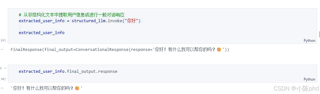 对于.with_structured_output()方法,如果我们希望模型返回一个Pydantic对象,只需要传入所需的Pydantic类即可,即UserInfo,代码如下所示: