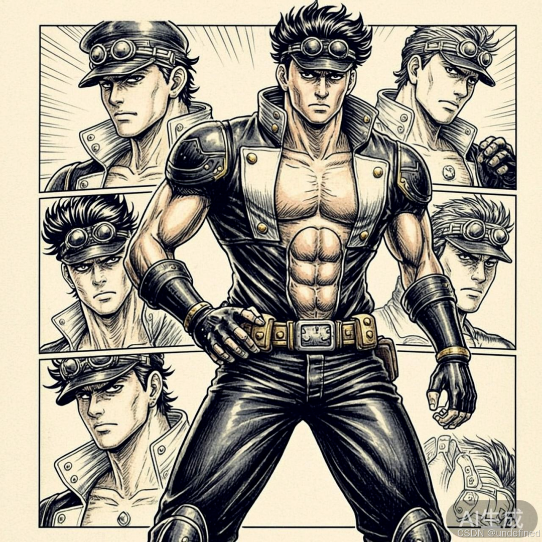 传统艺术扫描,纹理纸上的原始石墨铅笔素描。艺术风格明显为荒木飞吕彦,《JOJO的奇妙冒险》美学。粗犷、黑白漫画分镜感。全身镜头,摆出夸张、戏剧化的"JOJO立",肢体扭曲、不可能解剖结构、