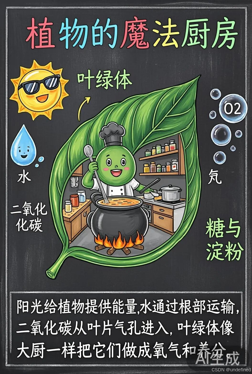 中央(加工): 巨大的绿色叶子剖面图,内部画成工厂车间,有一个戴厨师帽的绿色"叶绿体"卡通角色正在大锅里搅拌烹饪。