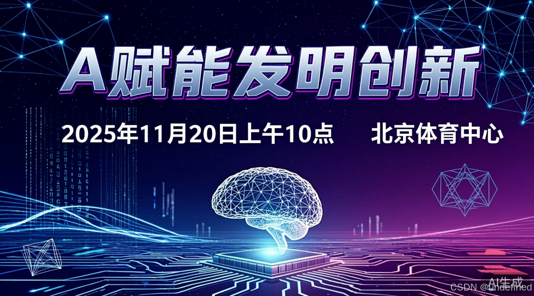 我要举办一场活动,主题为"A赋能发明创新",时间为2025年11 月20日上午10点,地点在北京体育中心,请帮我画一张宣传海 报,要求有科技感。