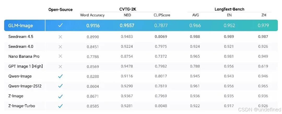 同时,GLM-Image 在文字渲染的权威榜单中达到开源 SOTA 水平。