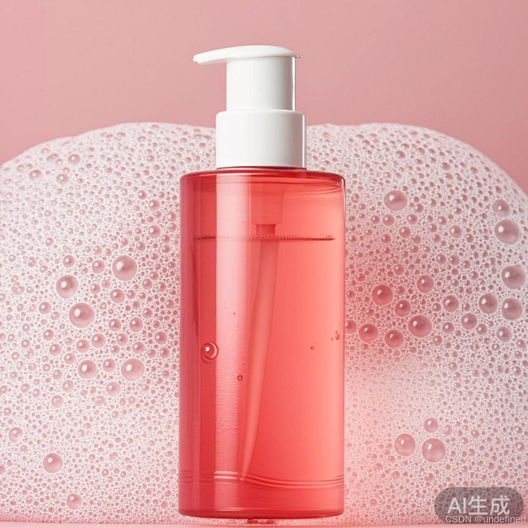 高端极简护肤品摄影。画面中央竖立着一瓶半透明的粉色液体洁面乳,配有白色按压泵头。瓶身浸润在柔和的粉色泡沫中,轻盈的泡沫向外扩散,形成光滑圆润的形状。细小的透明气泡漂浮在泡沫表面。干净的哑光粉色背景,