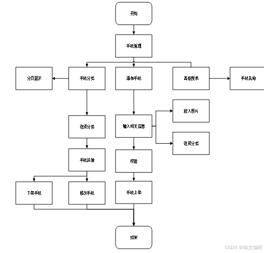 管理员可以通过分类筛选和高级搜索查找手机,查看手机详细信息、修改手机信息和下架手机。管理员还可以上架手机,输入手机的基本信息和对应的分类。如图所示