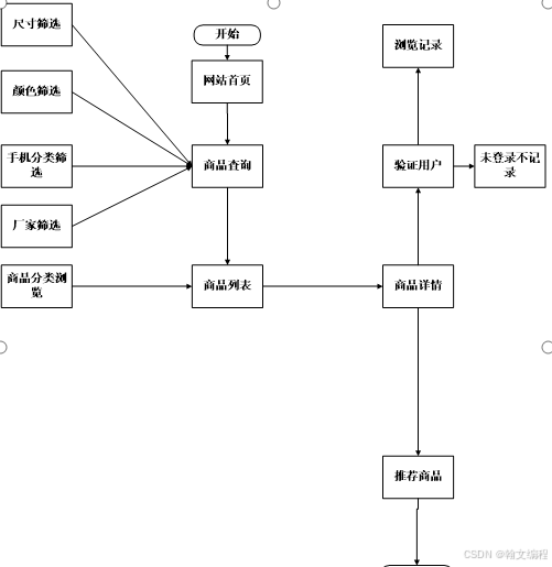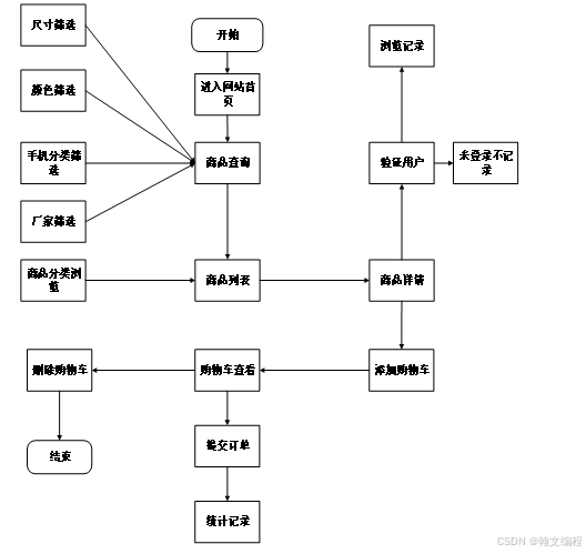 系统普通购物流程,系统通过访问系统,然后通过筛选条件,选择自己喜好的手机,提交购物车,然后提交订单,模拟支付,然后查看订单,具体流程如图4-6所示: