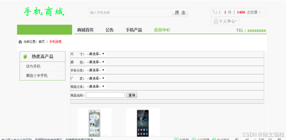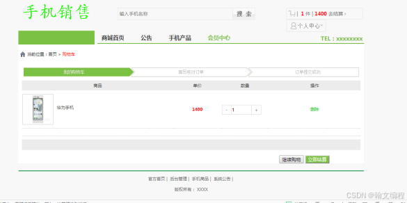 首页有个我的购物车的选项,点击进入就是购物车页面模块。购物车中显示了用户加入购物车的手机的列表。包括手机的名称、单价、购买数量。用户还可以修改手机的购买数量,删除某手机,也可以全部清空购物车。购物车中还显示所有手机一共的总价。点击结算,就会跳到支付的界面并且产生订单。支付成功订单的状态就是已支付,否则是未支付。订单的状态由管理员修改,如图所示