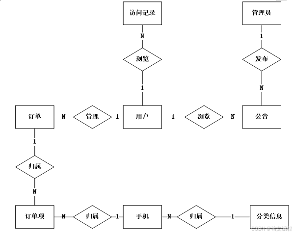 手机销售信息系统中,实体有用户实体,管理员实体,分类信息实体,手机实体,评论实体,公告实体,访问记录实体,订单实体,订单项实体等等,他们之间的关系如图4.11所示: