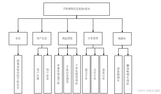 用户注册后或管理员输入自己的用户账号、密码,通过身份验证后可以进入相应的管理界面首页。用户页面分为修改个人信息、首页、浏览手机、在线下单等模块。管理员管理页面分为用户管理、手机管理、分类管理、订单管理等模块。