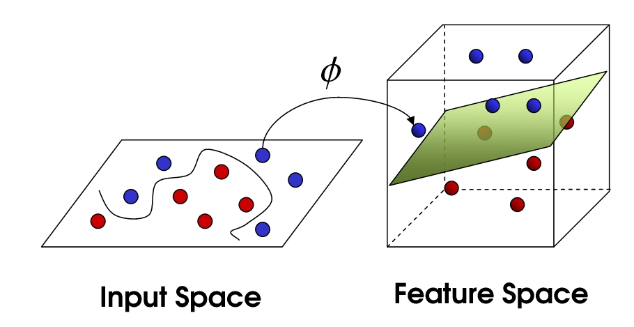 在二维平面分不开,我就把你映射到三维空间去!在更高维度,原来的非线性问题往往就变成了线性问题。但是,直接计算高维映射(比如把 3维 映射到 9维)计算量太大了,甚至会爆炸。