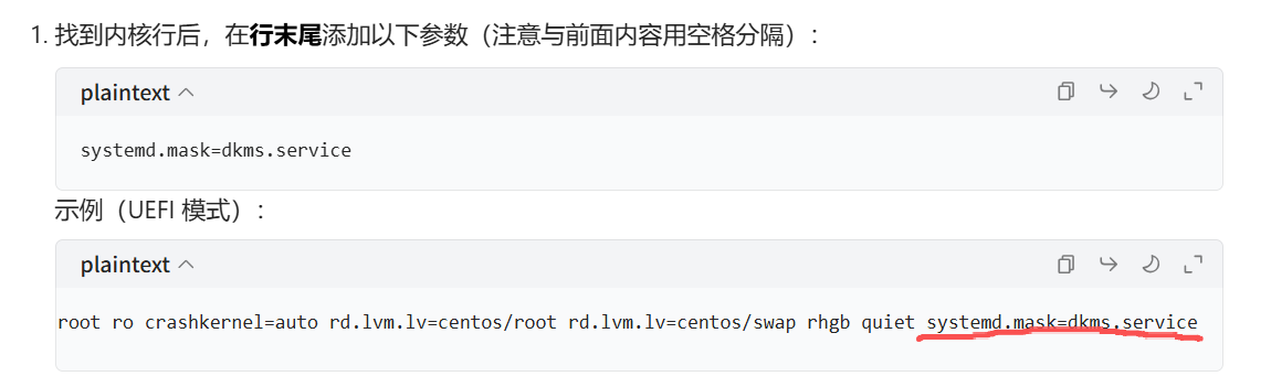 临时的解决办法是跳过dkms编译步骤,在系统启动界面的切换内核页面时,按e进入编辑,优先找linux16/linuxefi/linux开头的行,添加systemd.mask=dkms.service。然后就可以正常进系统了,