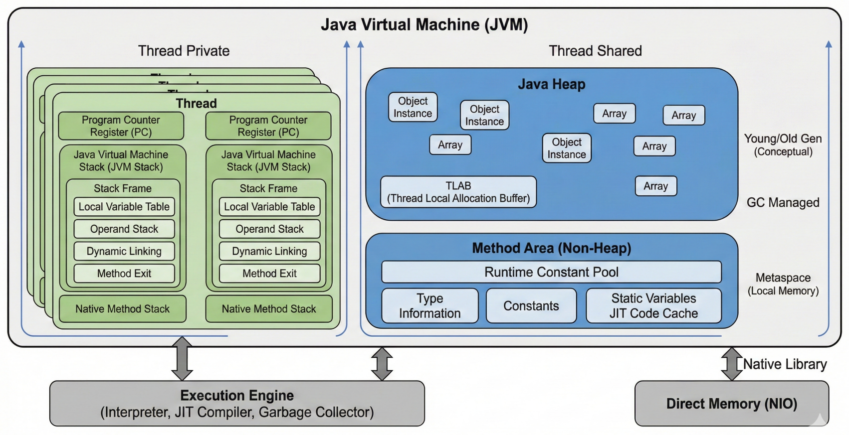 | 方法区 | 否 (共享) | 类信息、静态变量、常量 | OOM | JDK 8 后变为 Metaspace (本地内存) |