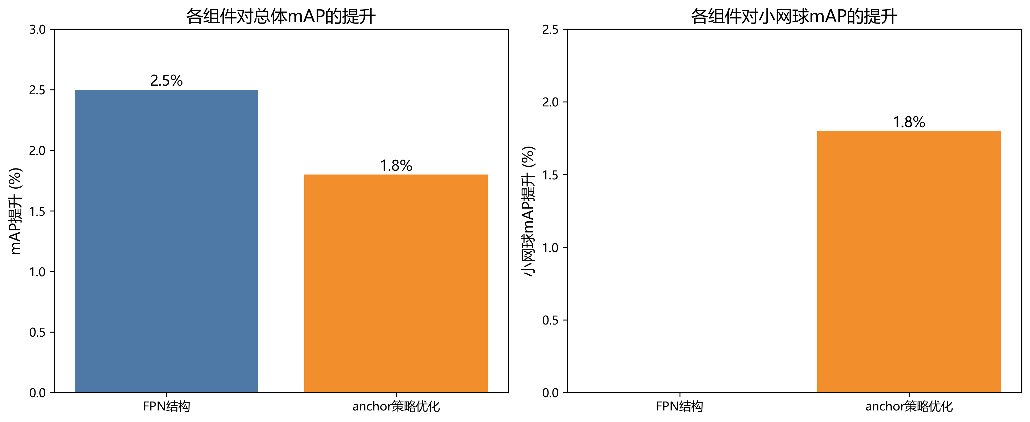 我们还进行了消融实验,以验证各个组件的贡献。实验结果表明,FPN结构对多尺度检测性能的提升最为显著,贡献了约2.5%的mAP增长;而anchor策略的优化则对小网球检测有明显的帮助,提高了约1.8%的小网球mAP。