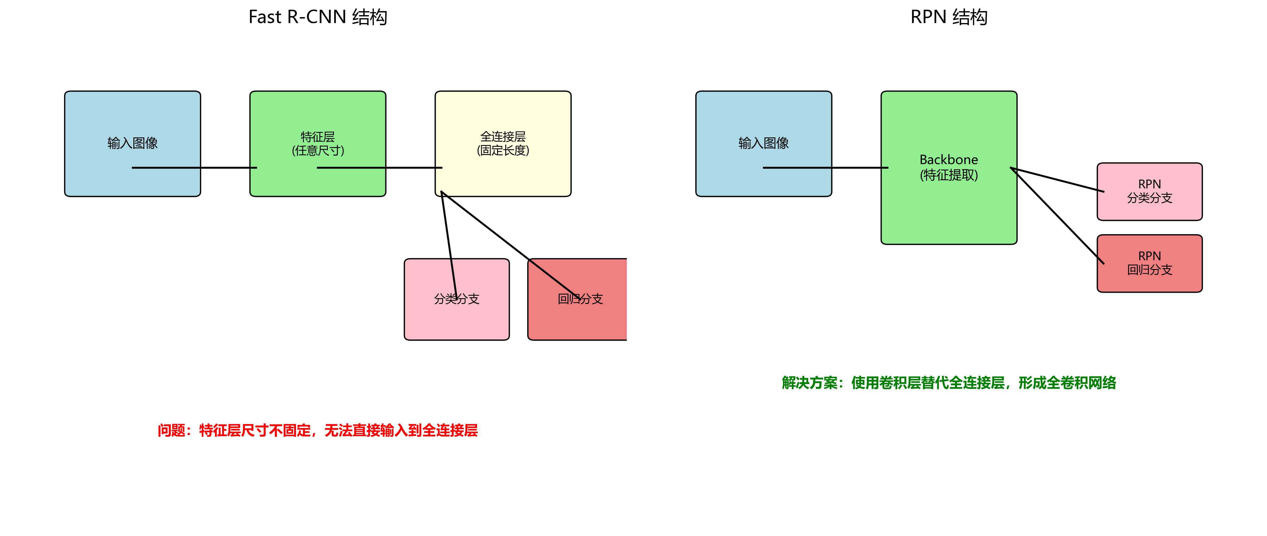 于是,可将候选区域的生成看成是二分类问题+回归问题。Fast R-CNN分类分支+回归分支的输入是固定长度的特征向量,分类子网络和采用回归子网络均采用全连接层。这种方法不适用于生成候选区域,原因是:输入图像任意尺寸,得到的特征层也是任意的,特征的维度不是固定的。为解决这种问题,RPN的分类分支和回归分支均采用卷积层,于是RPN是全卷积网络(backbone+分类子网络+回归子网络)