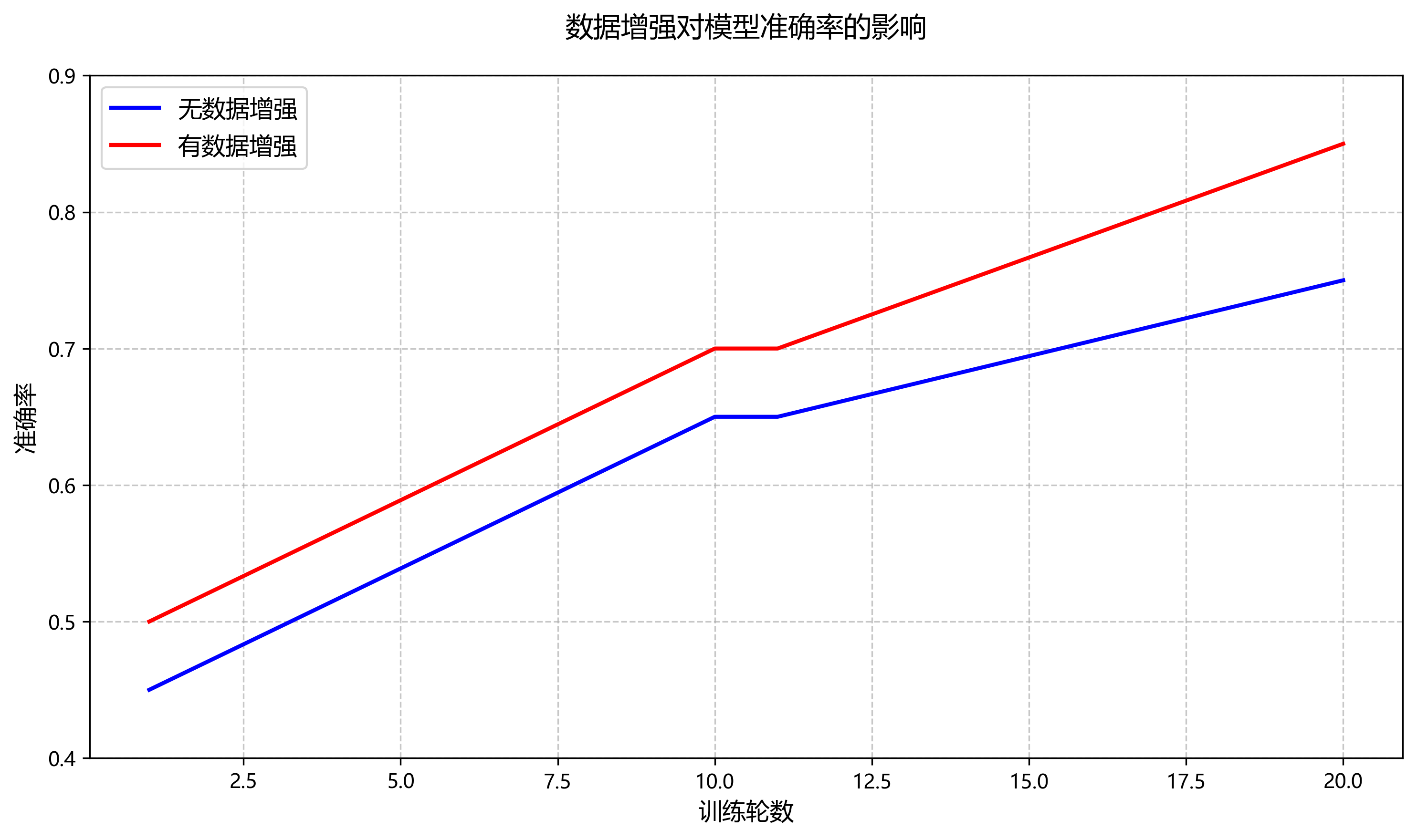 数据增强是扩充训练数据的有效手段,本研究采用多种数据增强技术来提高模型的鲁棒性。除了随机翻转、亮度和对比度调整以及随机裁剪外,还采用了以下增强技术:随机旋转(±15度)、随机缩放(0.8-1.2倍)以及添加高斯噪声(方差0.01)。这些增强技术使训练集的有效数据量扩大至约15000张,有效缓解了数据量不足的问题。