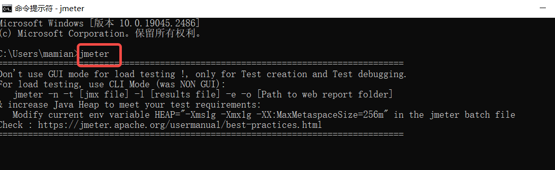 输入命令jmeter即可启动JMeter工具