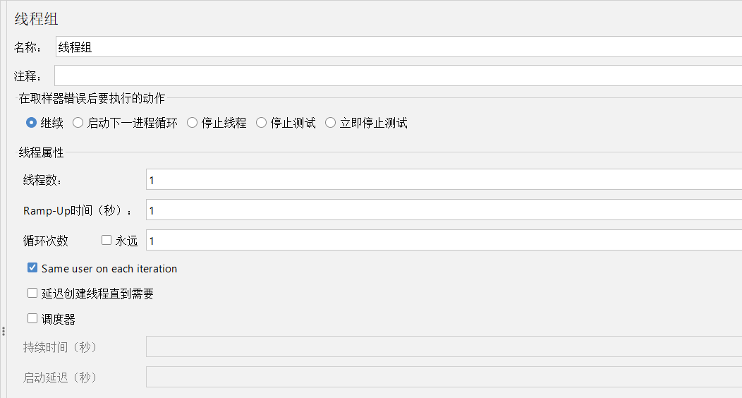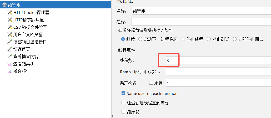 线程数:一个线程即一个测试用户,设置发送的请求次数