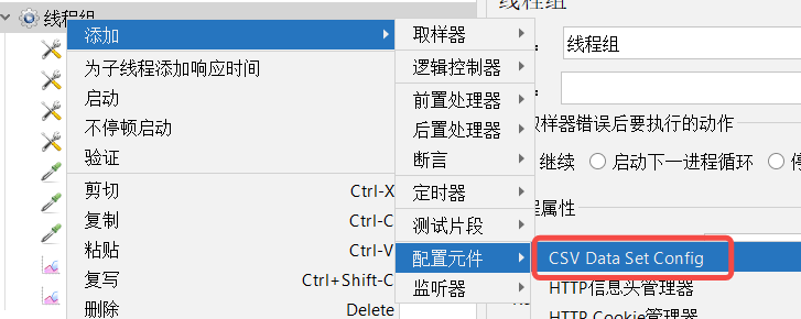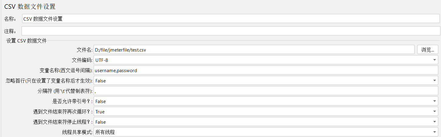添加方式:线程组------配置元件------CSV数据文件设置