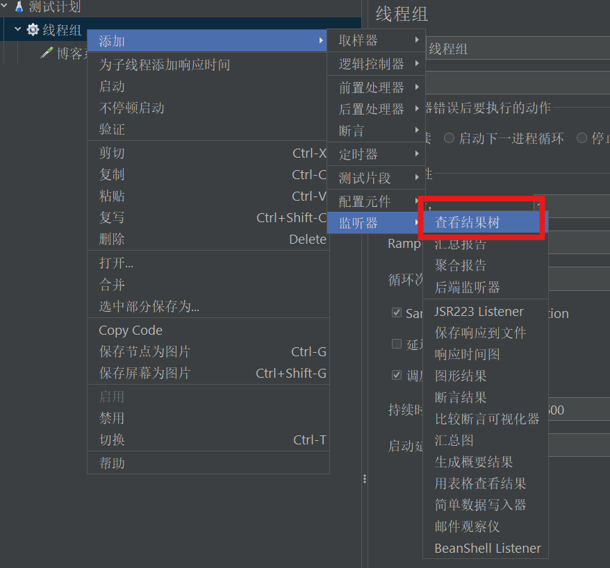 5)在"线程组"下添加"查看结果树"监听器