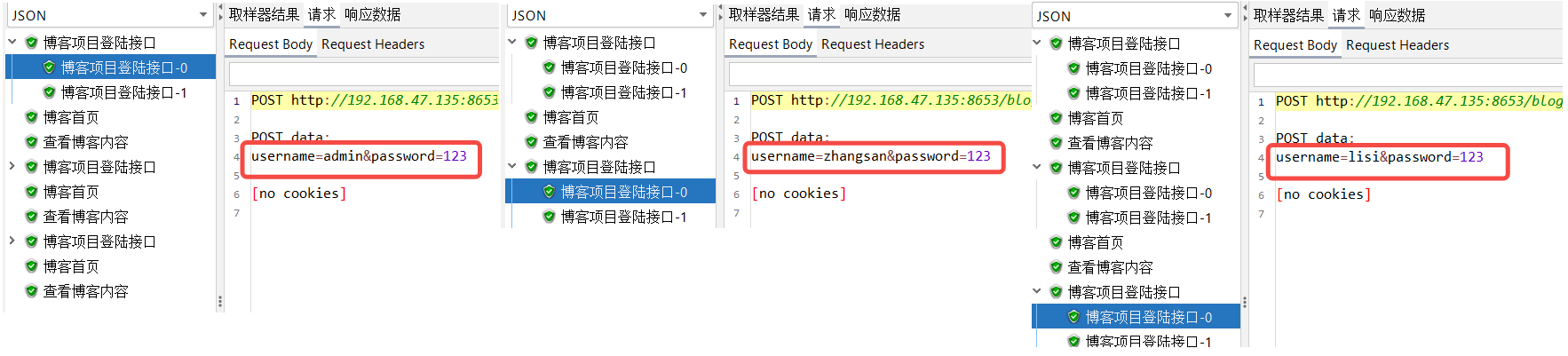 修改完该配置后,登陆接口发起请求时将从csv文件中获取配置好的username和password参数,获取顺序为从上往下依次获取