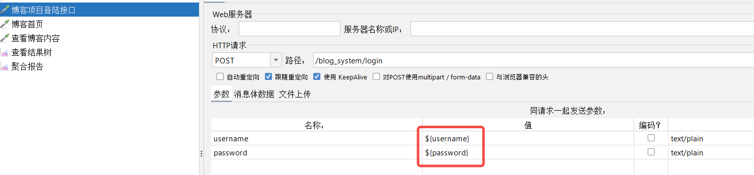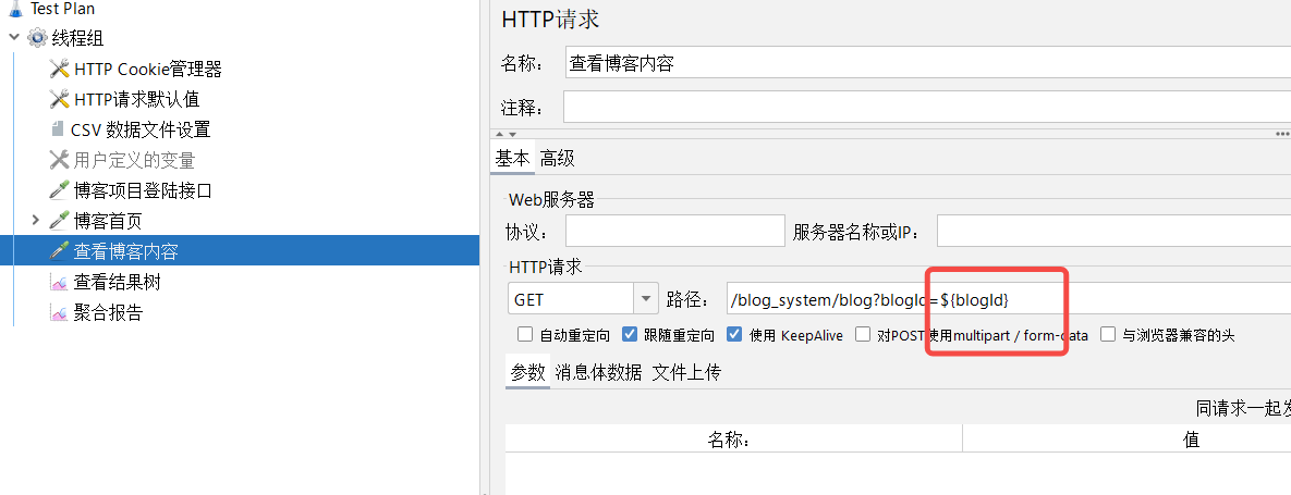 使用:在HTTP请求的取样器中引入定义的变量。${参数名}