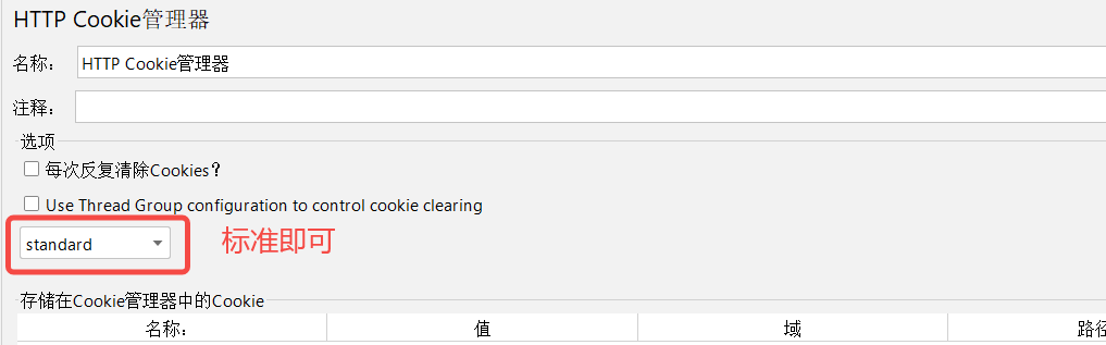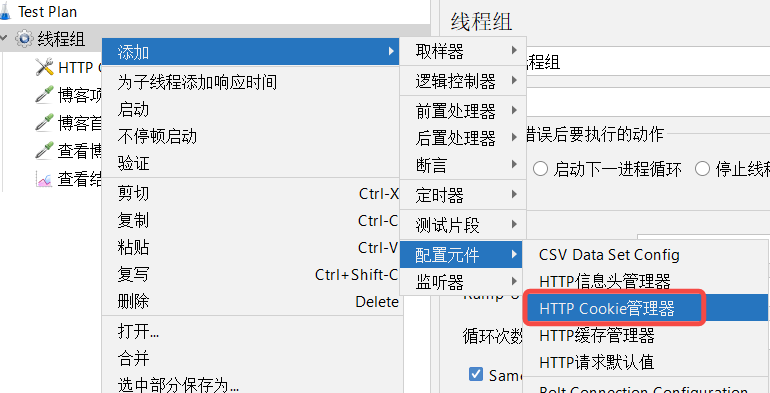 HTTP Cookie管理器像Web浏览器⼀样存储和发送Cookie。如果HTTP请求并且响应包含cookie,则 Cookie管理器会自动存储该cookie,并将其用于将来对该特定网站的所有请求。每个JMeter线程都有自动的"cookie存储区"。因此,正在测试使用cookie存储会话信息的网站,则每个JMeter线程都将拥 有自动的会话。此类Cookie不会显示在Cookie管理器显示屏上,可以使用"查看结果树监听器"查看。缓存配置可选择standard(标准)或compatibility(兼容的),当然也可以手工添加一些cookie.