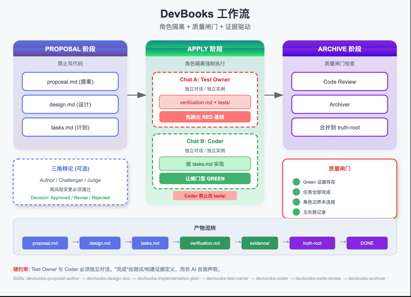 DevBooks 引入了 双轨制开发 ,强制要求:写测试的 AI 和 写代码的 AI 必须分开!