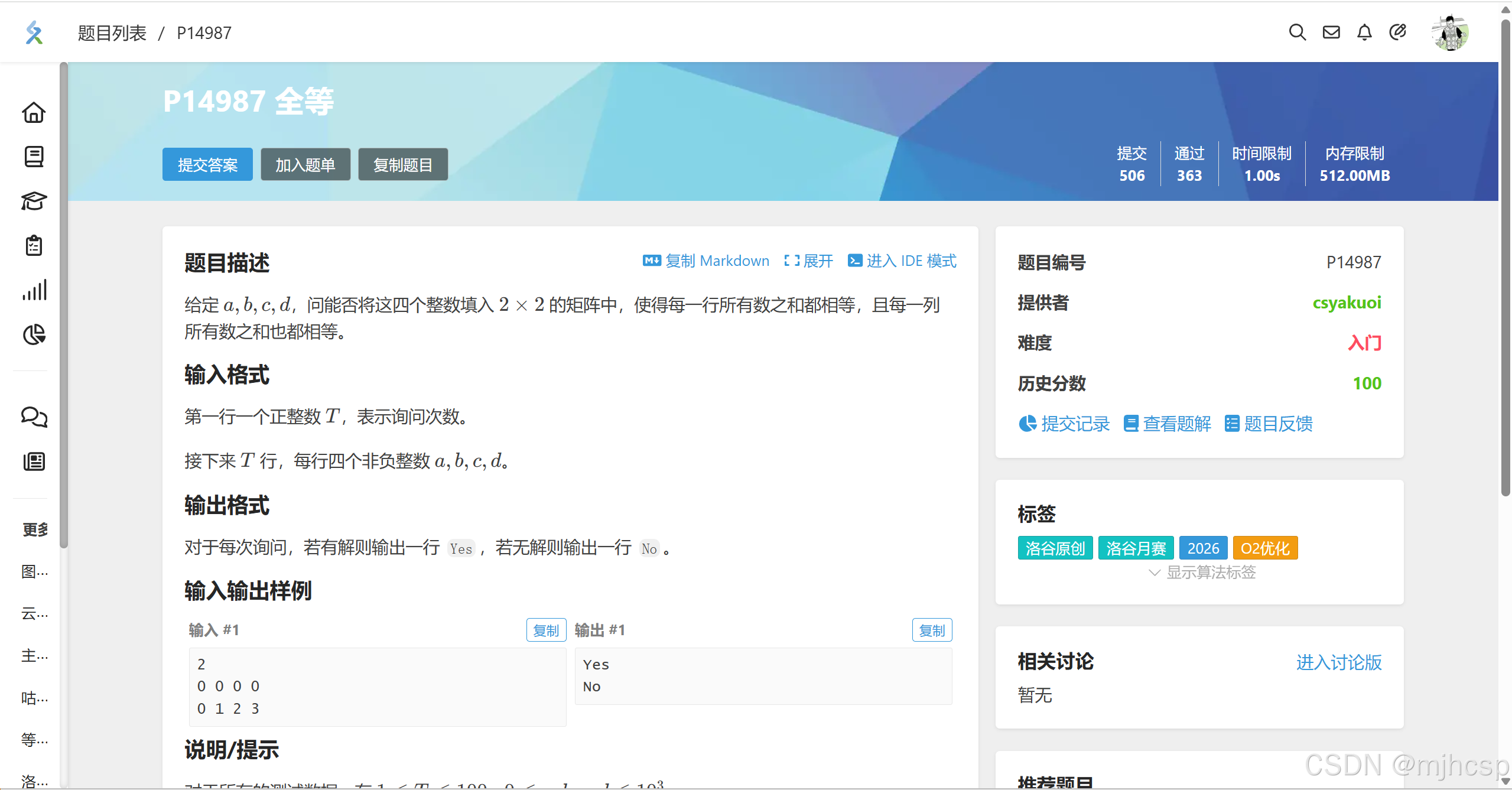 给定 a , b , c , d a,b,c,d a,b,c,d,问能否将这四个整数填入 2 × 2 2 \times 2 2×2 的矩阵中,使得每一行所有数之和都相等,且每一列所有数之和也都相等。