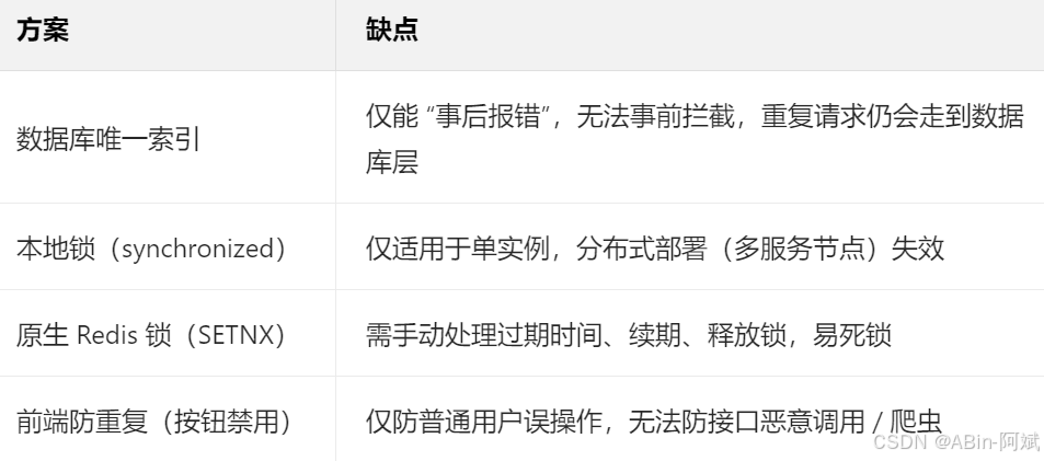- 事前拦截:从后端兜底杜绝重复请求,适配分布式架构,性能远优于数据库方案;